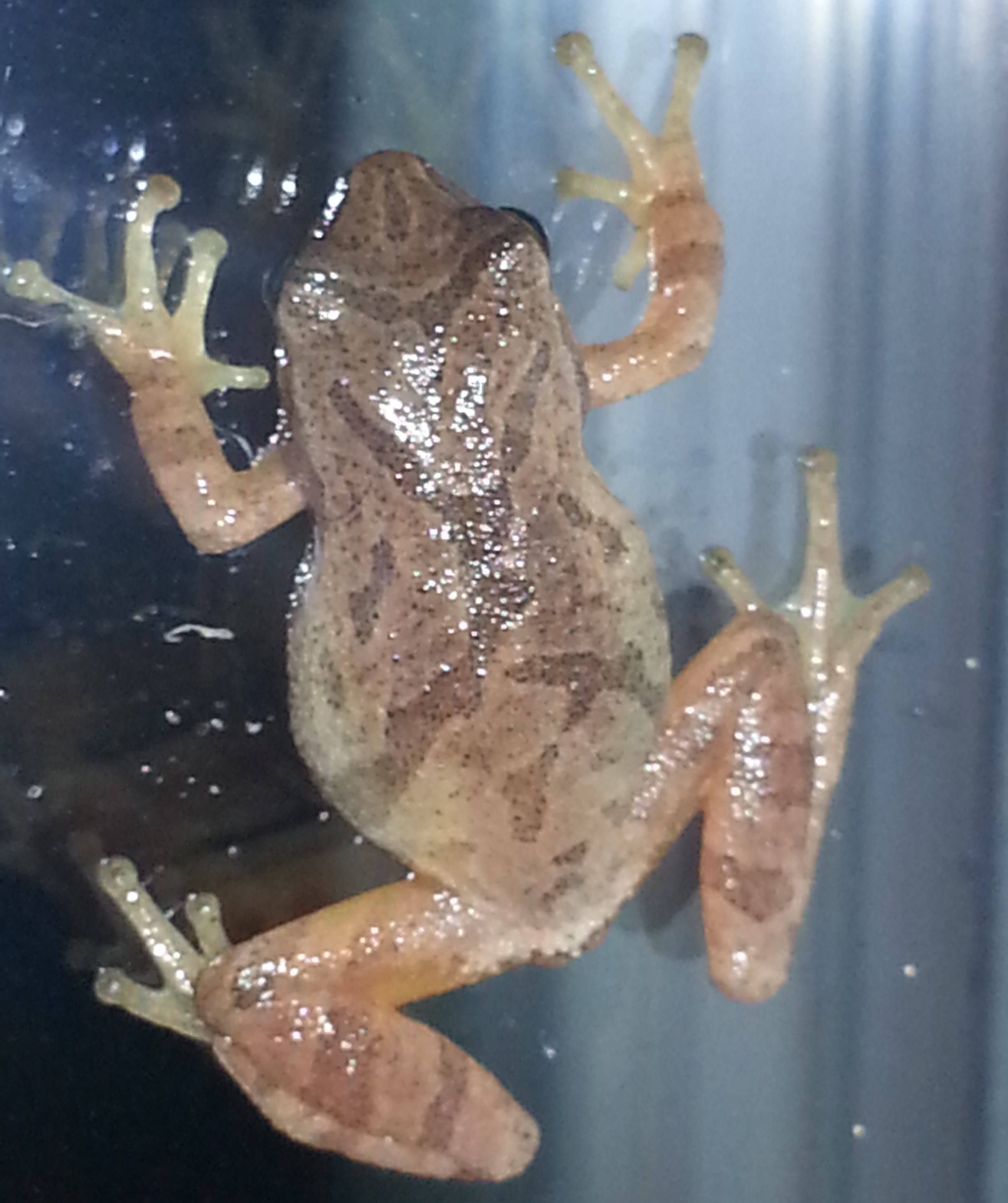 Spring peeper on patio door. Red maple flowers along edge of forested wetland.