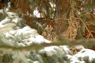 10_337-2008-02-13_3 Published January 3, 2019 at 1600 × 1064 in January 1-7, 2019 (Week 1 of 52): Winter Raptor Watching is an Exciting Way to Start the New Year ← Previous Next → Short-eared owl in daytime conifer roost (photo by Tom Poczciwinski)