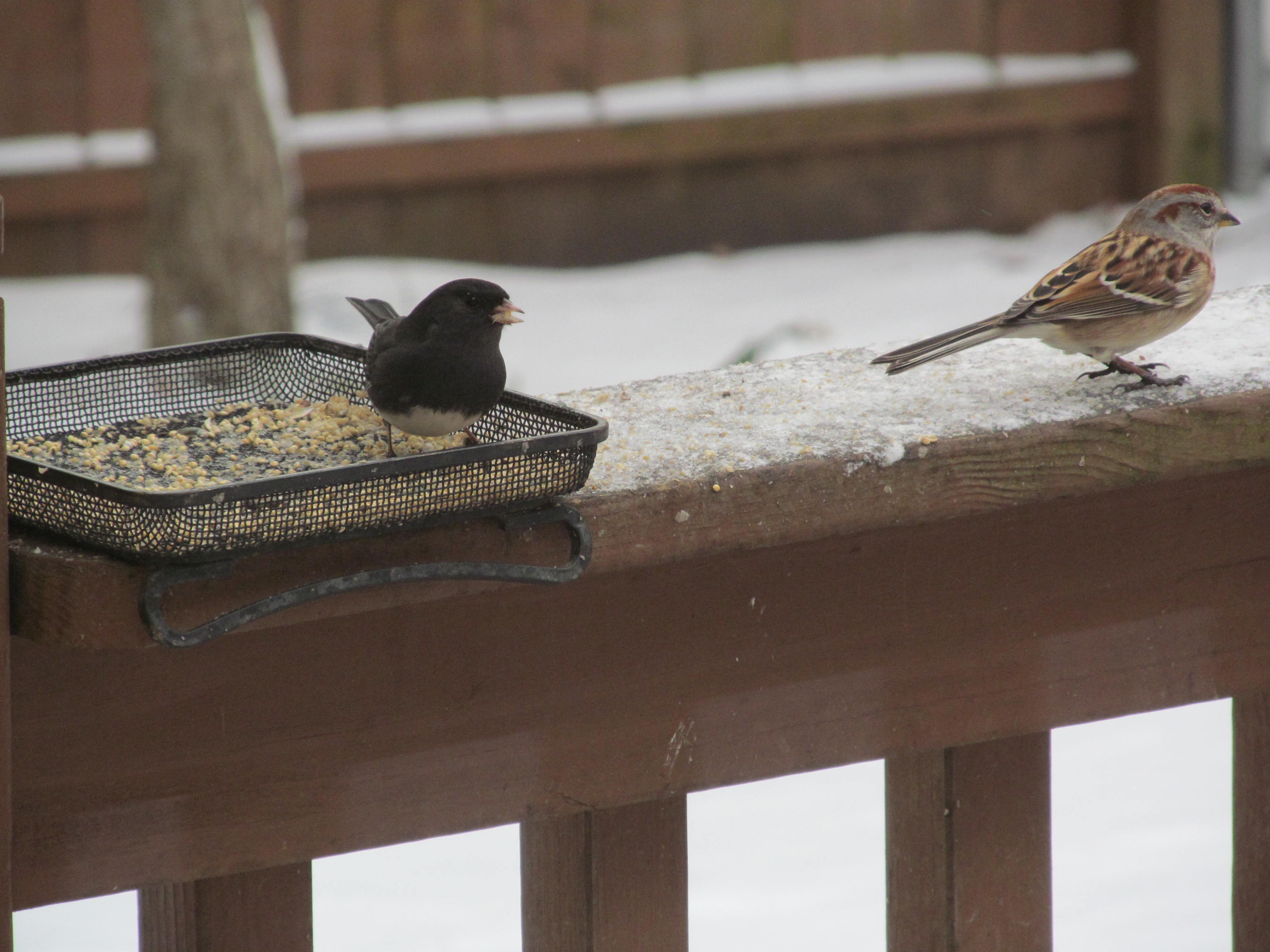 20_IMG_1963 Published November 7, 2019 at 3072 × 2304 in November 12-18, 2018 (Week 46 of 52): Our Landscape has been Transformed Following Leaf-Drop ← Previous Next → Junco and American tree sparrow feeding on white millet