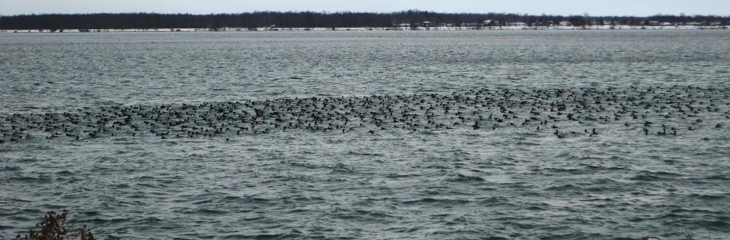 2_DSC00612 (2)_Jacquie Walters Published December 6, 2019 at 1024 × 337 in December 3-9, 2018 (Week 49 of 52): Tremendous Numbers of Ducks Overwinter on the Great Lakes and Niagara River Next → Large raft of diving ducks, mostly canvasback and scaup (photo by Jacquie Walters, NYSDEC)